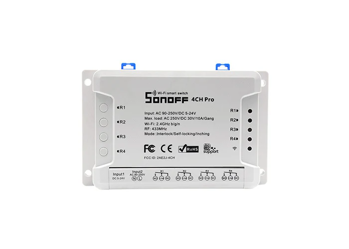 Sonoff 4CH Pro & 4CH Pro R2 are 4 gang WiFi switches. They support switching among 3 working modes: interlock/self-locking/inching mode, and both supports to set 1-16s delay in inching mode. This feature allows you to let your switch turn on for a few seconds then goes off, which works like a pulse switch. They integrate with a 433.92MHz RF receiver module, making them possible to be controlled by RF Remote. The smart switches are DIN Rail mounted.
